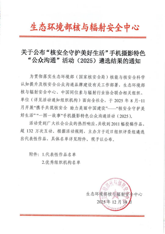 近日,由生态环境部核与辐射安全中心、中国同位素与辐射行业协会联动相关组织、单位组织开展的“携手共筑核安全 助力美丽中国建设”——“核安全守护美好生活” 圆满落幕,太阳成集团tyc33455cc在本次活动中获评“优秀组织机构”。