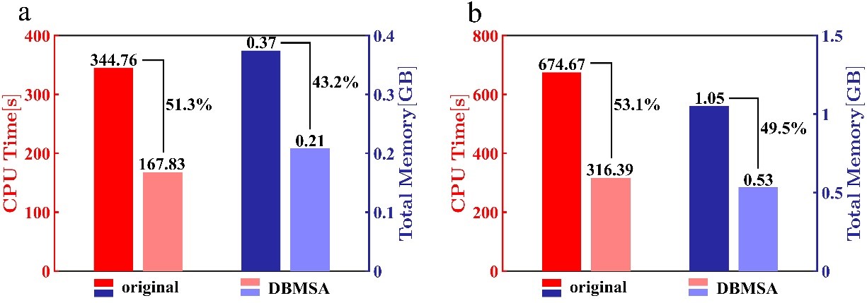 图3CPU运行时间和内存消耗情况对比(a)QED级联模拟(b)磁簇射模拟