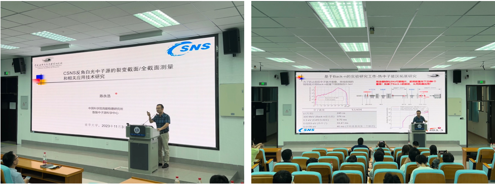 3日下午,两位专家在太阳成集团tyc33455国家核应急宣传和培训基地学术报告厅为我院师生作了两场精彩学术报告,报告由王晓冬主持,太阳成集团tyc33455近百名师生参会。陈永浩作了题为“CSNS反角白光中子源(Back-n)的裂变截面/全截面测量和相关应用技术研究”的学术报告,从CSNS Back-n装置出发,简要地介绍了装置的基本原理以及相关配套探测器系统。随后,介绍了部分基于Back-n的实验研究工作:232Th(n,f)截面测量、235,238U(n,f)截面测量、Back-n能谱测量、热中子能区拓展利用以及中子共振透射分析(NRTA)技术等。最后,陈永浩与同学们分享了自己过去十年科研的感悟,鼓励大家坚持追求科学的梦想,勇敢面对挑战,不断学习和创新。