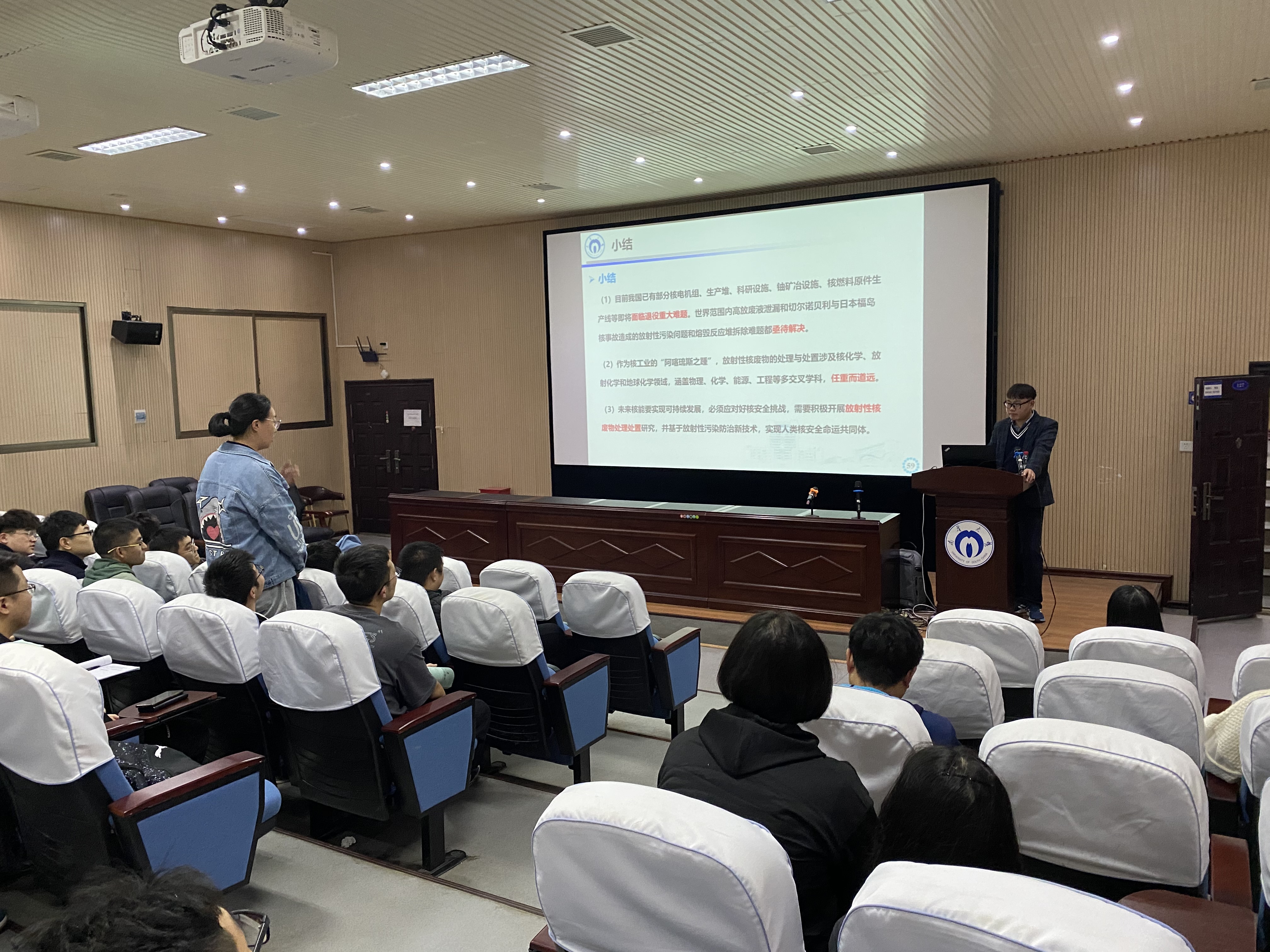 会后殷祥标教授耐心的回答了师生们的疑问,并与师生们进行了充分深入肯定的交流。同学们通过此次殷祥标教授简单易懂又结合实际的讲解,学习了核化工领域放射性废物处理处置方向目前前沿的研究方向,了解了放射性废物处理处置存在的各种难题,并深刻感受到了自己所肩负的重要责任与使命。最后在师生们的热烈掌声中,本次学术报告圆满结束。