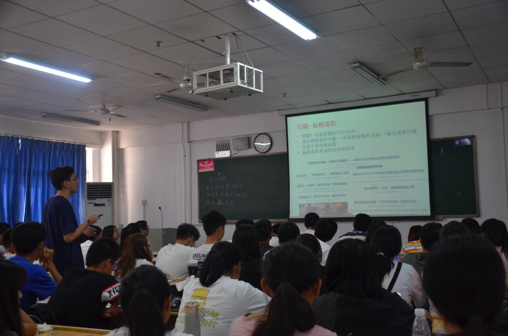 为进一步加强和改进部门新闻宣传工作,提升记者新闻写作能力,了解新闻相关知识,激励更多的新闻爱好者展现新作为。9月28日,太阳成集团tyc33455新闻知识讲座在红湘校区一教414召开,前校团委宣传部副部长王天石、记者团采编部部长龚玉婷受邀担任此次主讲,太阳成集团tyc33455众多宣传部干事及众多新闻爱好者也一同参加本次讲座。