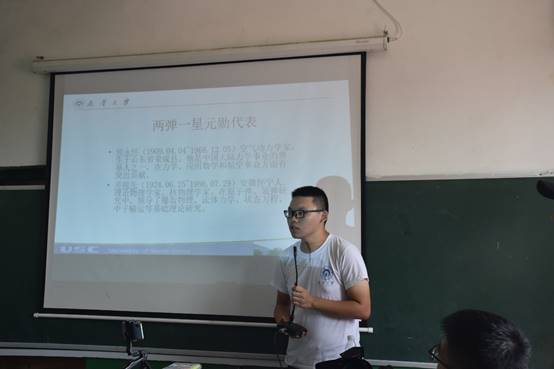 在课堂上团队成员钟挚化身“小胖哥哥”,向各位小朋友宣讲两弹一星精神,以邓稼先,郭永怀两位元勋的光荣事迹为例,生动形象地向小朋友们介绍了第一代核工业人劈山路斩荆棘的艰苦奋斗、无私奉献的伟大精神。当讲到郭永怀先生誓死保卫数据而壮烈牺牲时,在场小朋友们无不动容。通过此次两弹一星精神宣讲,为小朋友们树立了爱国主义榜样,引导他们形成家国情怀。