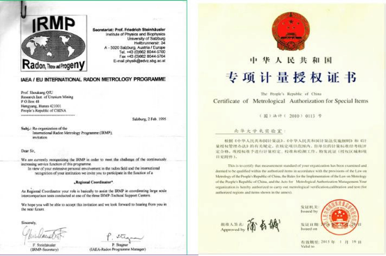 IAEA氡计量协调实验室邀请函 国家氡计量授权证书