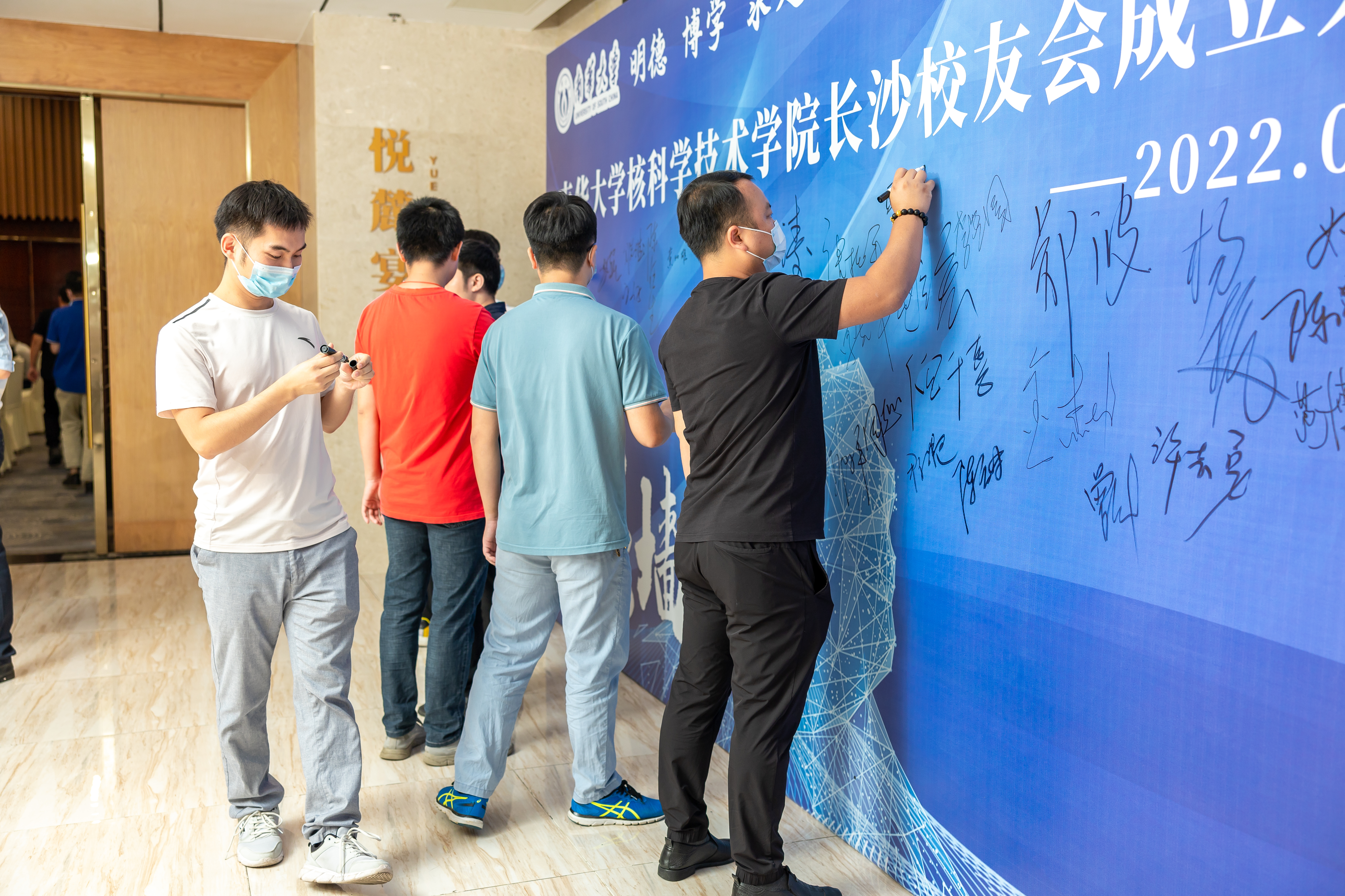 校友们在签名墙上签名